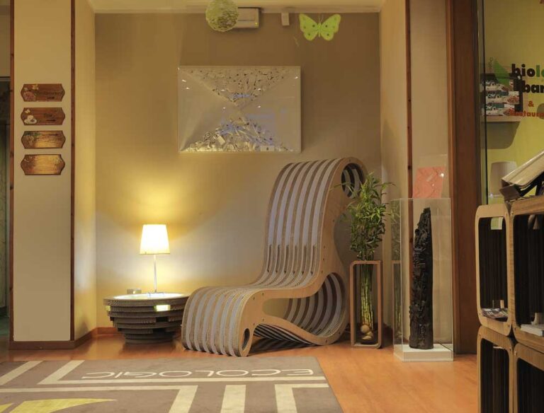 大厅和有机酒吧的陈设由回收纸板和FSC木材制成。