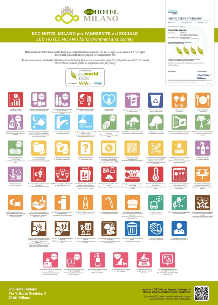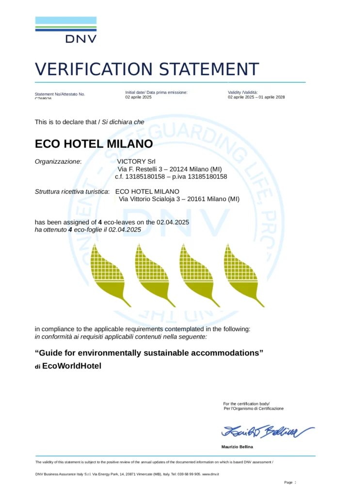 DNV被定义为第三方机构,它是Eco Hotel Milano和EcoWorldHotel的外部公司,这是因为我们坚信我们的承诺应该由外部专业人士认证,以保证我们的客户对我们所做的事情有最大的透明度和真实性。